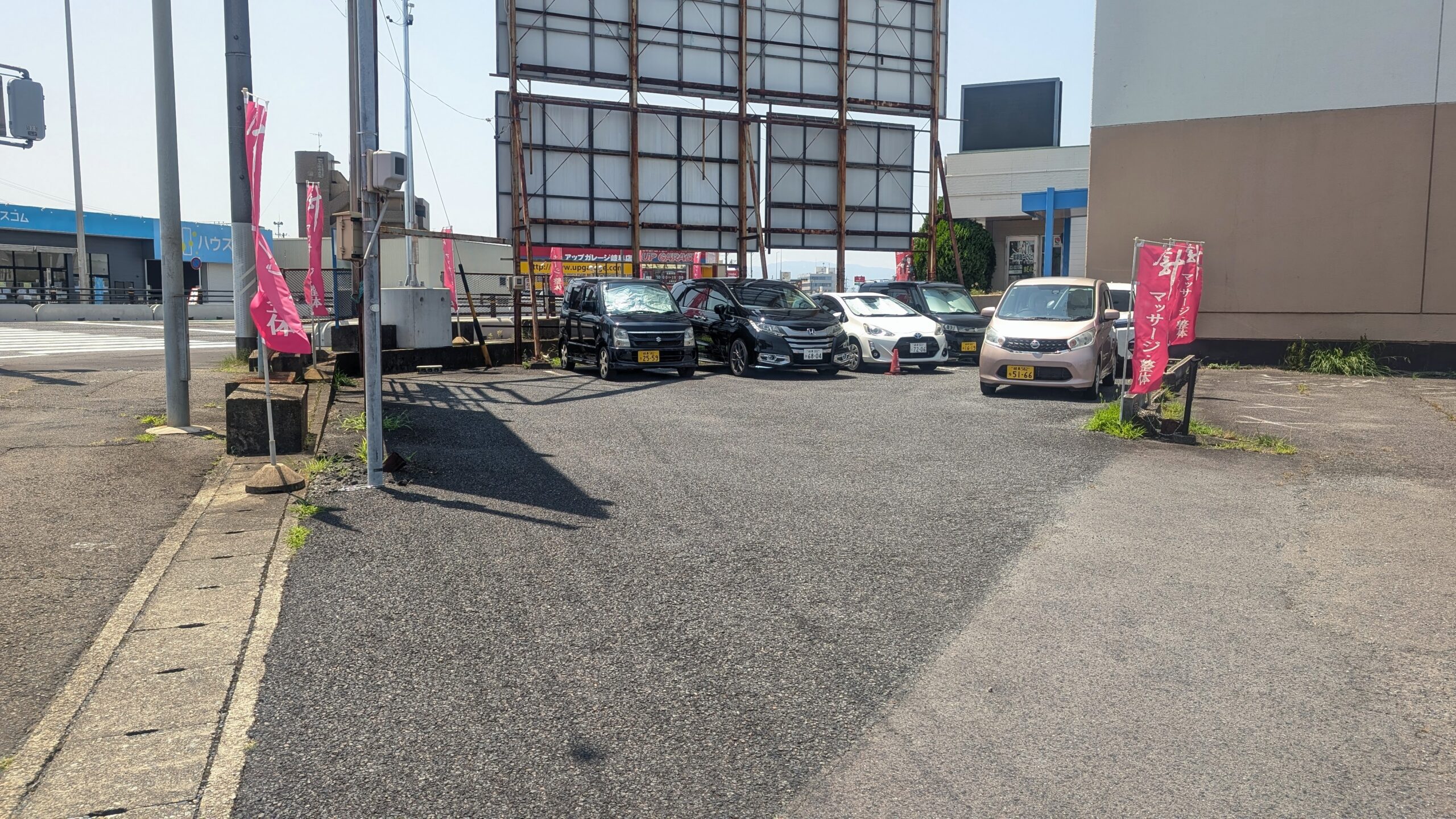 横断歩道を渡った側、ピンクの旗に囲まれているところが第2駐車場です。